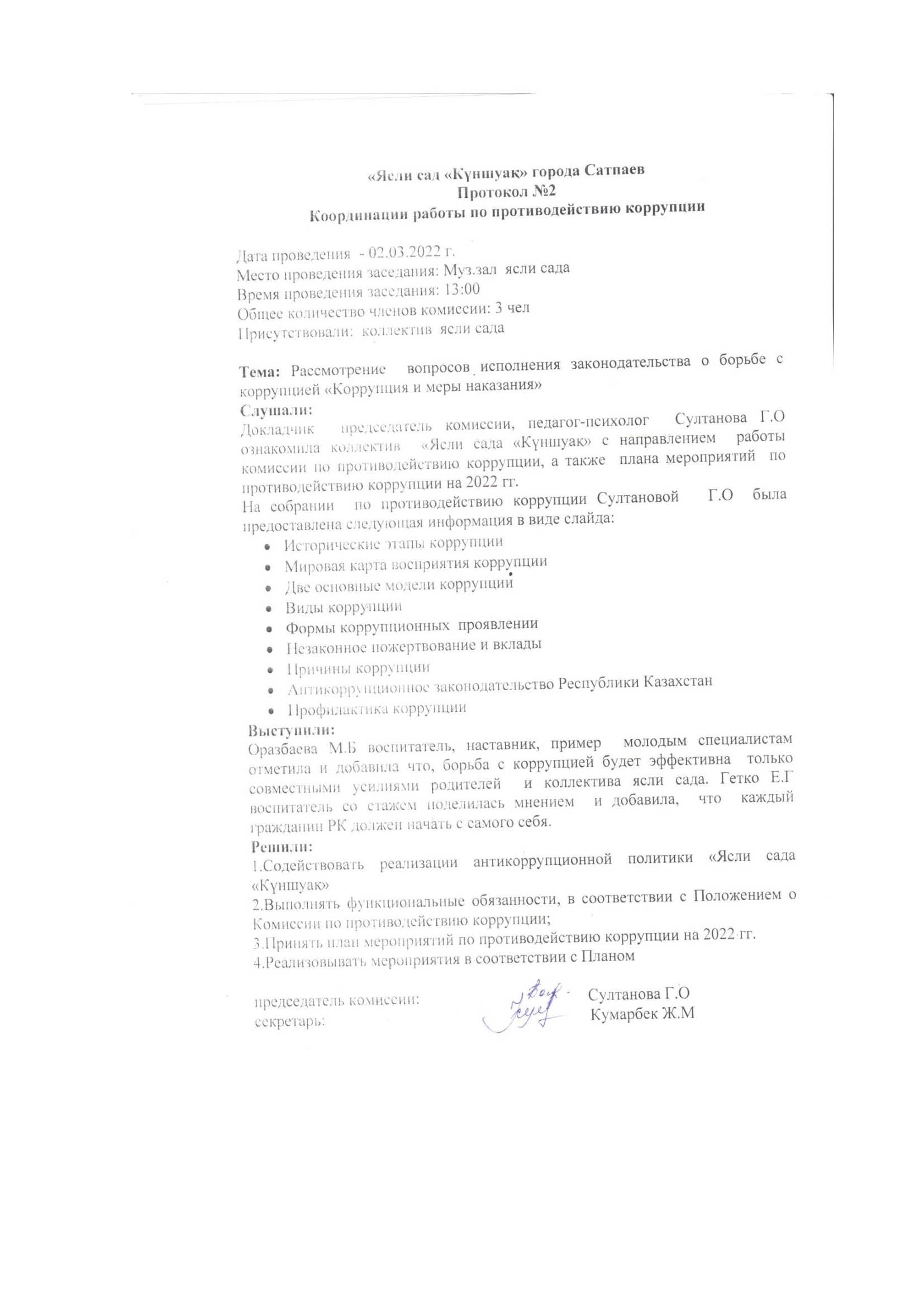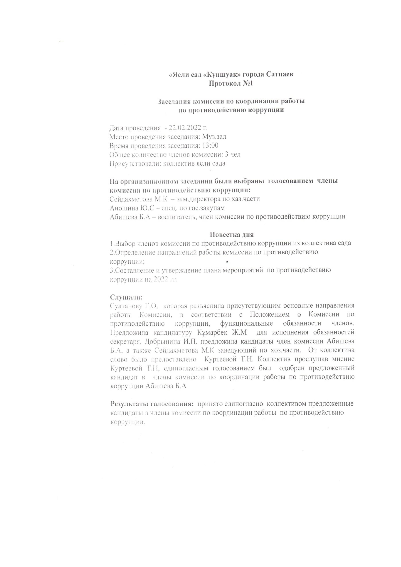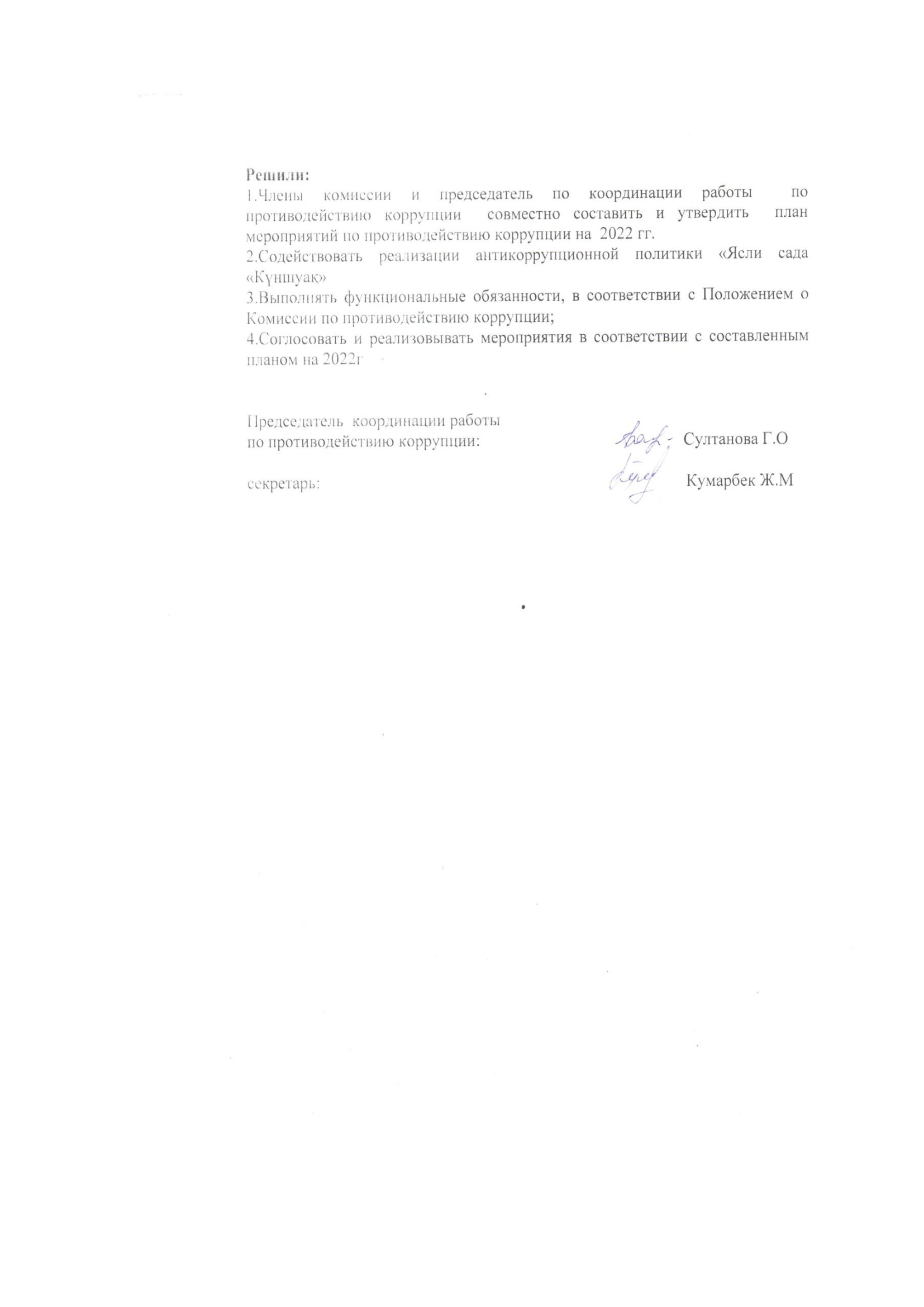 В январе месяце 2022г на первом установочном коллективном собрании единогласно был составлен состав комиссии, а также приказом была назначена комплайнс офицер - педагог-психолог Султанова Г.О по исполнению антикоррупционной стратегии Республикик Казахстан в ясли саду «Күншуақ». А также комплайнс офицером был составлен годовой план мероприятии по противодействию коррупции в сфере деятельности ясли сада.Директором а также офицером комплайнс службы были рассморены вопросы исполнения законодательства о борьбе с коррупцией.