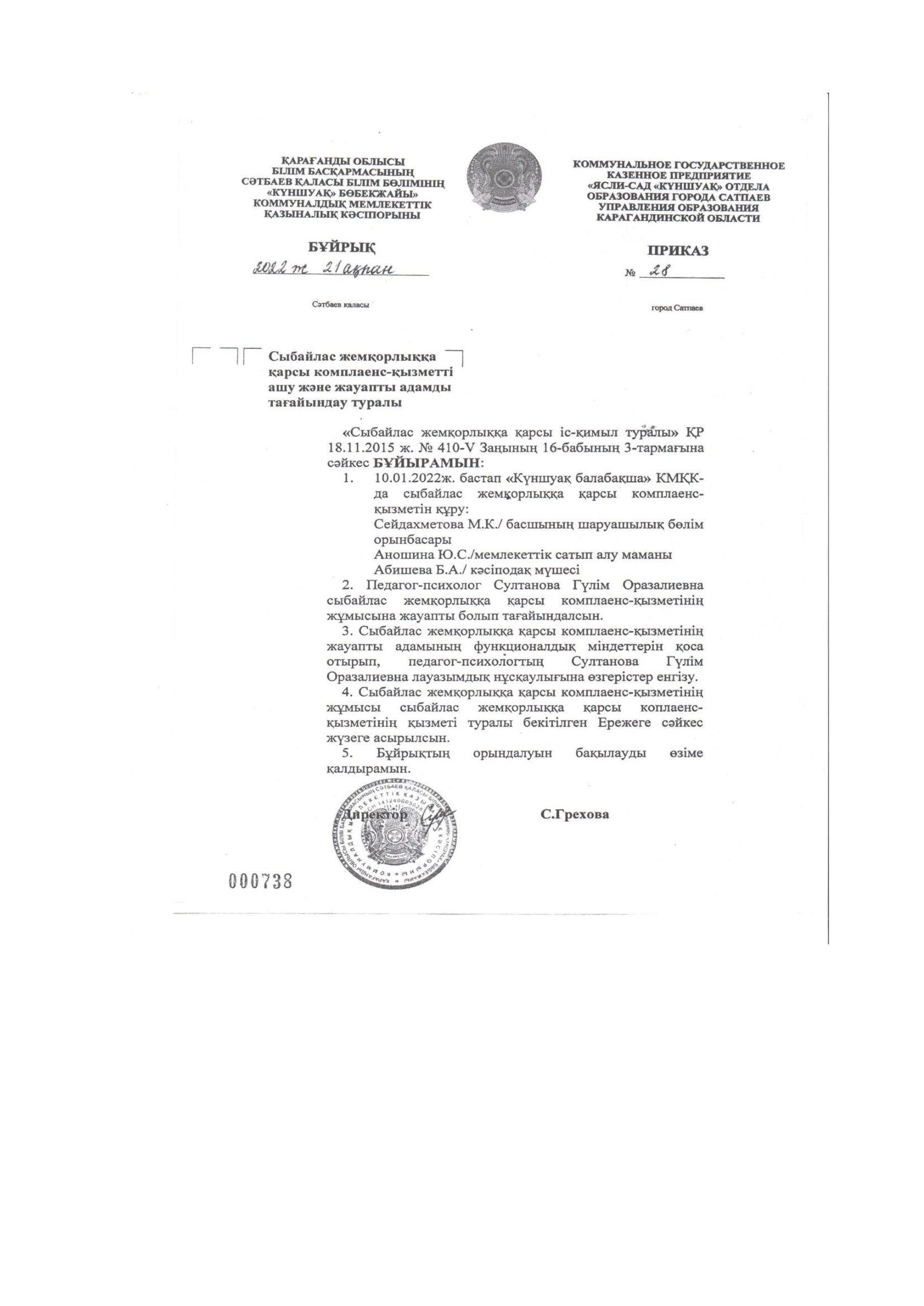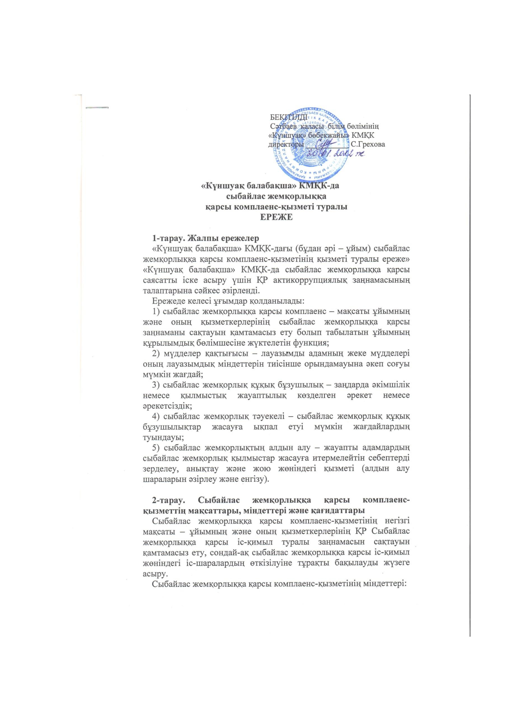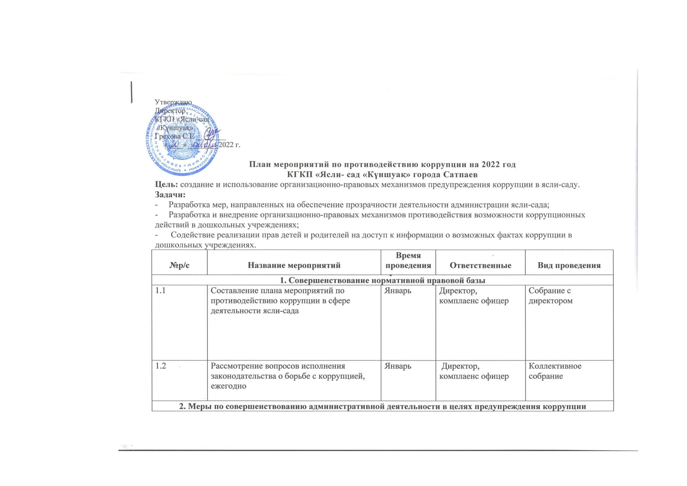 В январе месяце 2022г на первом установочном коллективном собрании единогласно был составлен состав комиссии, а также приказом была назначена комплайнс офицер - педагог-психолог Султанова Г.О по исполнению антикоррупционной стратегии Республикик Казахстан в ясли саду «Күншуақ». А также комплайнс офицером был составлен годовой план мероприятии по противодействию коррупции в сфере деятельности ясли сада.Директором а также офицером комплайнс службы были рассморены вопросы исполнения законодательства о борьбе с коррупцией.